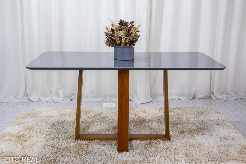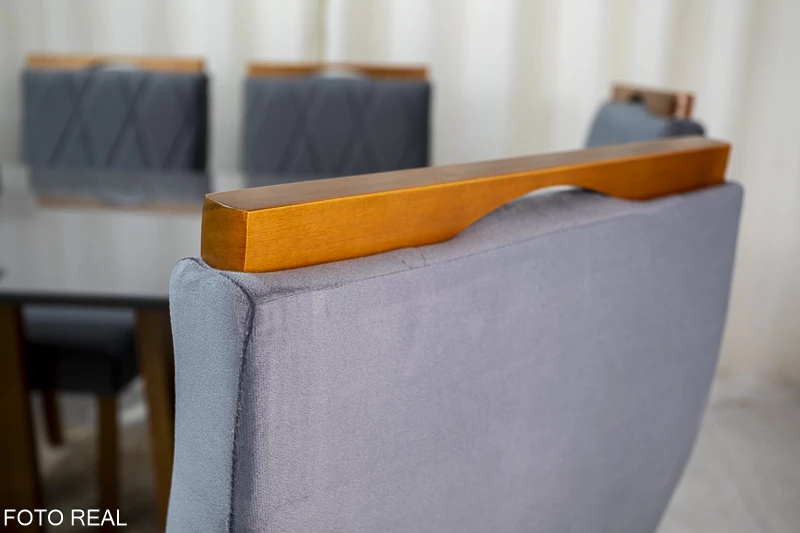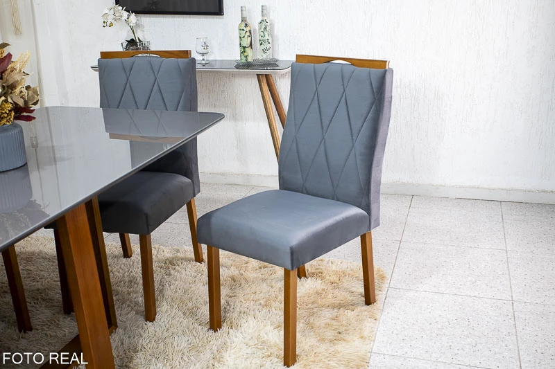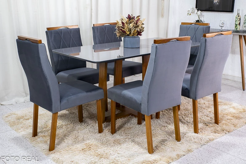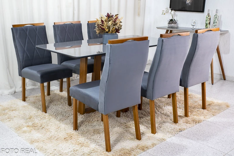 Mesa de Jantar Pedro Mel Vidro Grafite 160×80 6 Cadeiras Lisboa Veludo Cinza 507 Madeira Maciça Art Assento – Entregue Montada