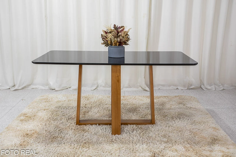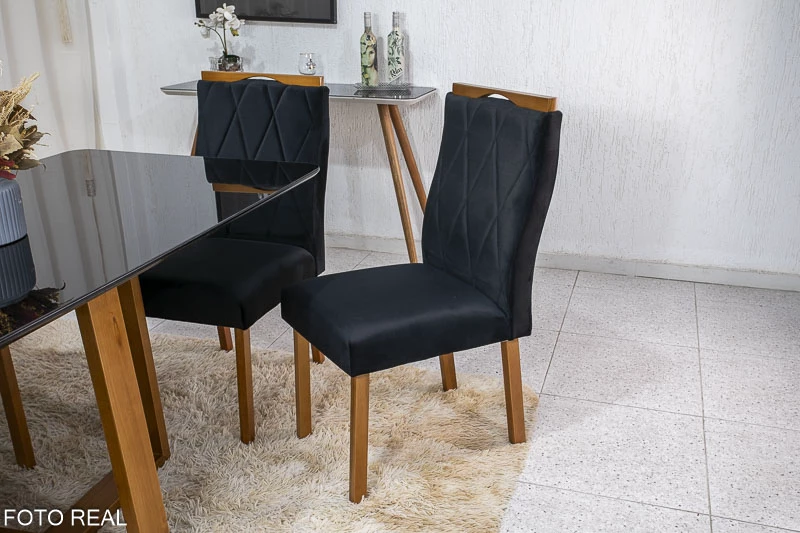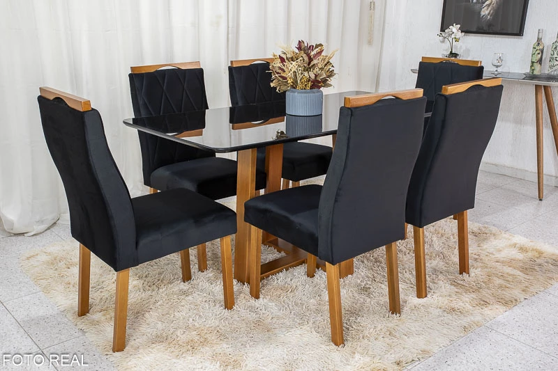 Mesa de Jantar Pedro Mel Vidro Preto 160×80 6 Cadeiras Lisboa Veludo Preto 504 Madeira Maciça Art Assento – Entregue Montada